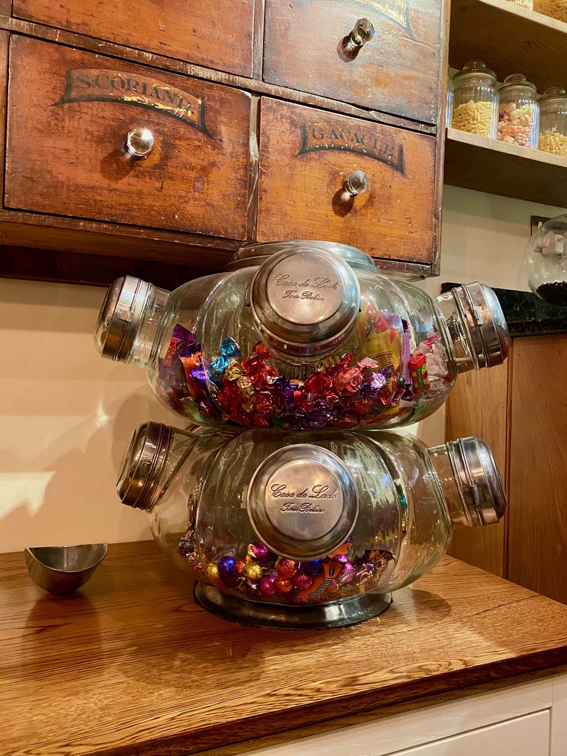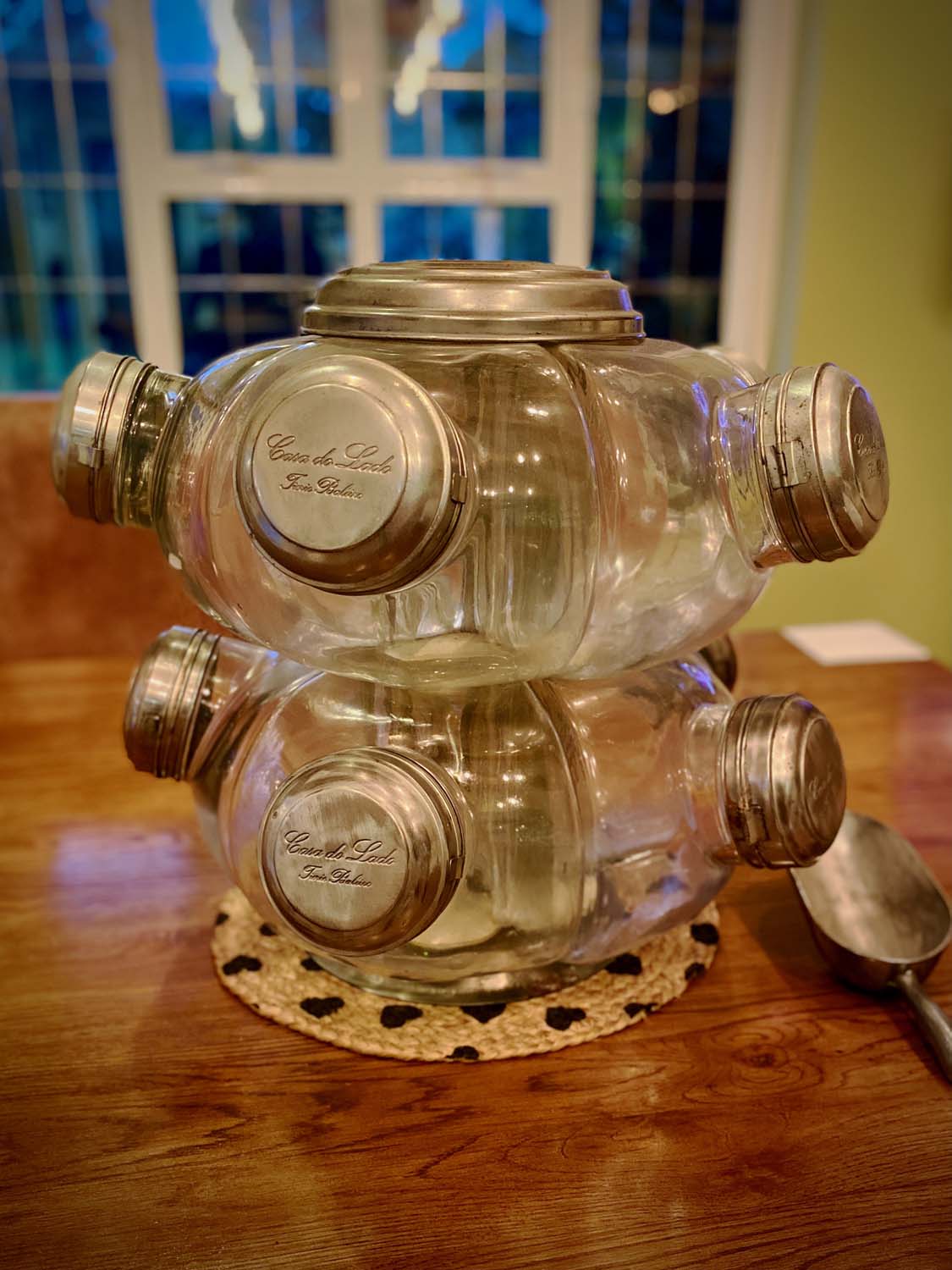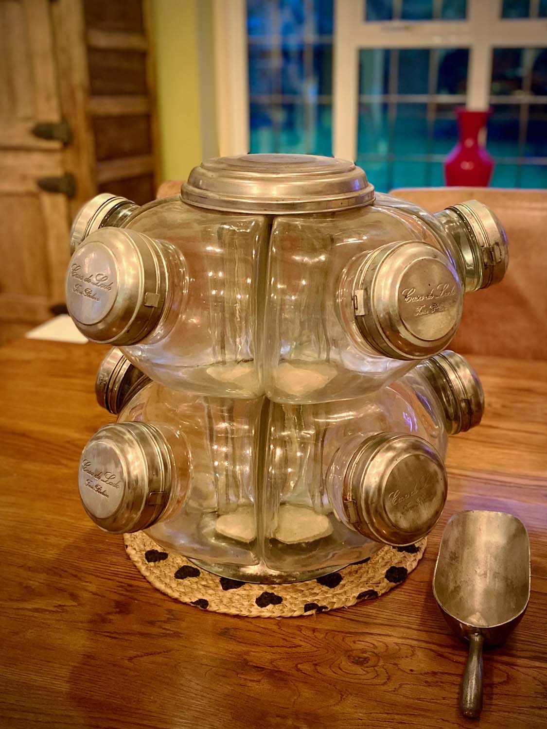 This Balliero consists of 10 separate glass jar which are clamped together by bolts and steel plates. Each jar has its own fold open lid and the whole unit spins on its base, hence the name “Balliero".