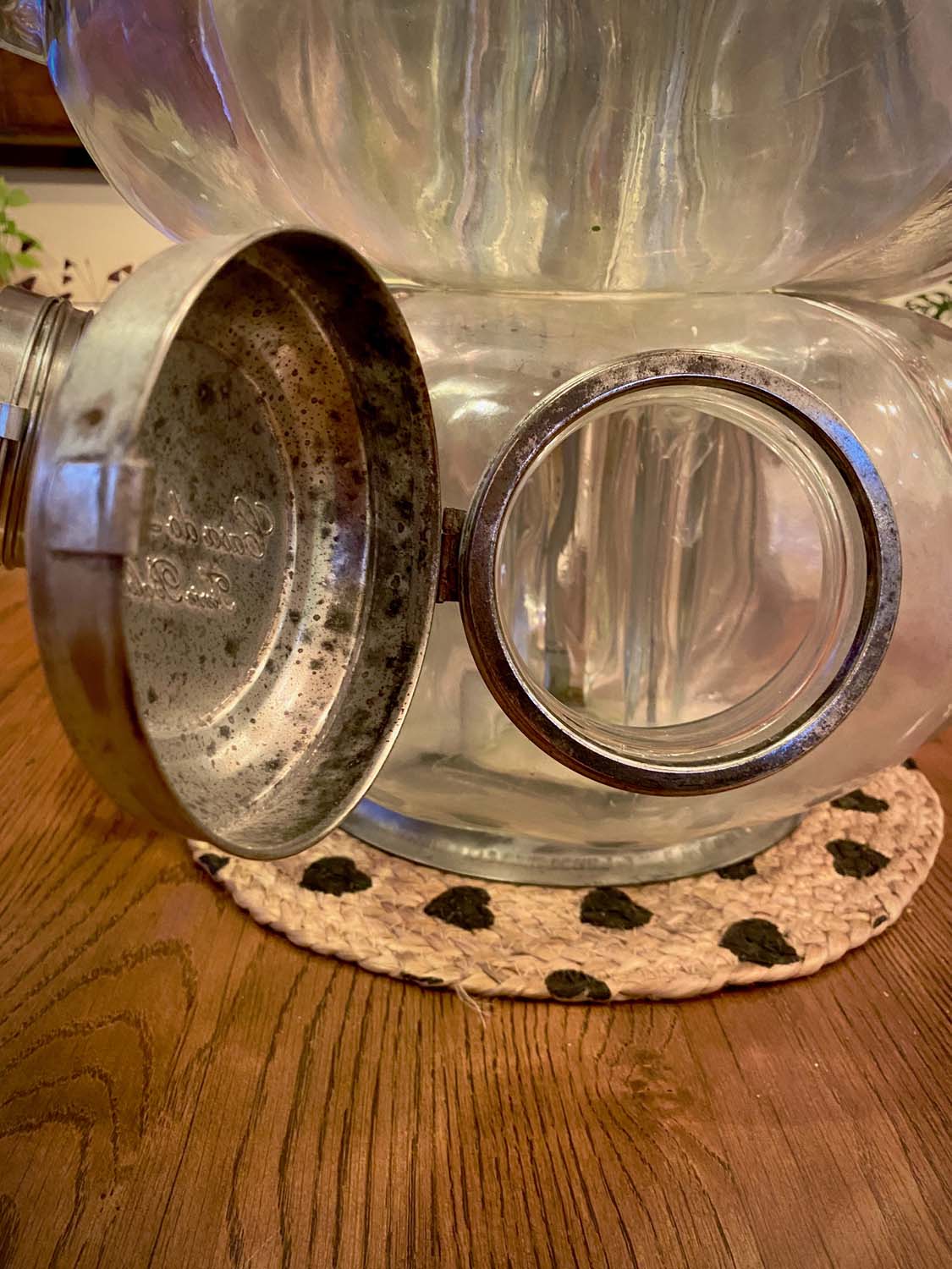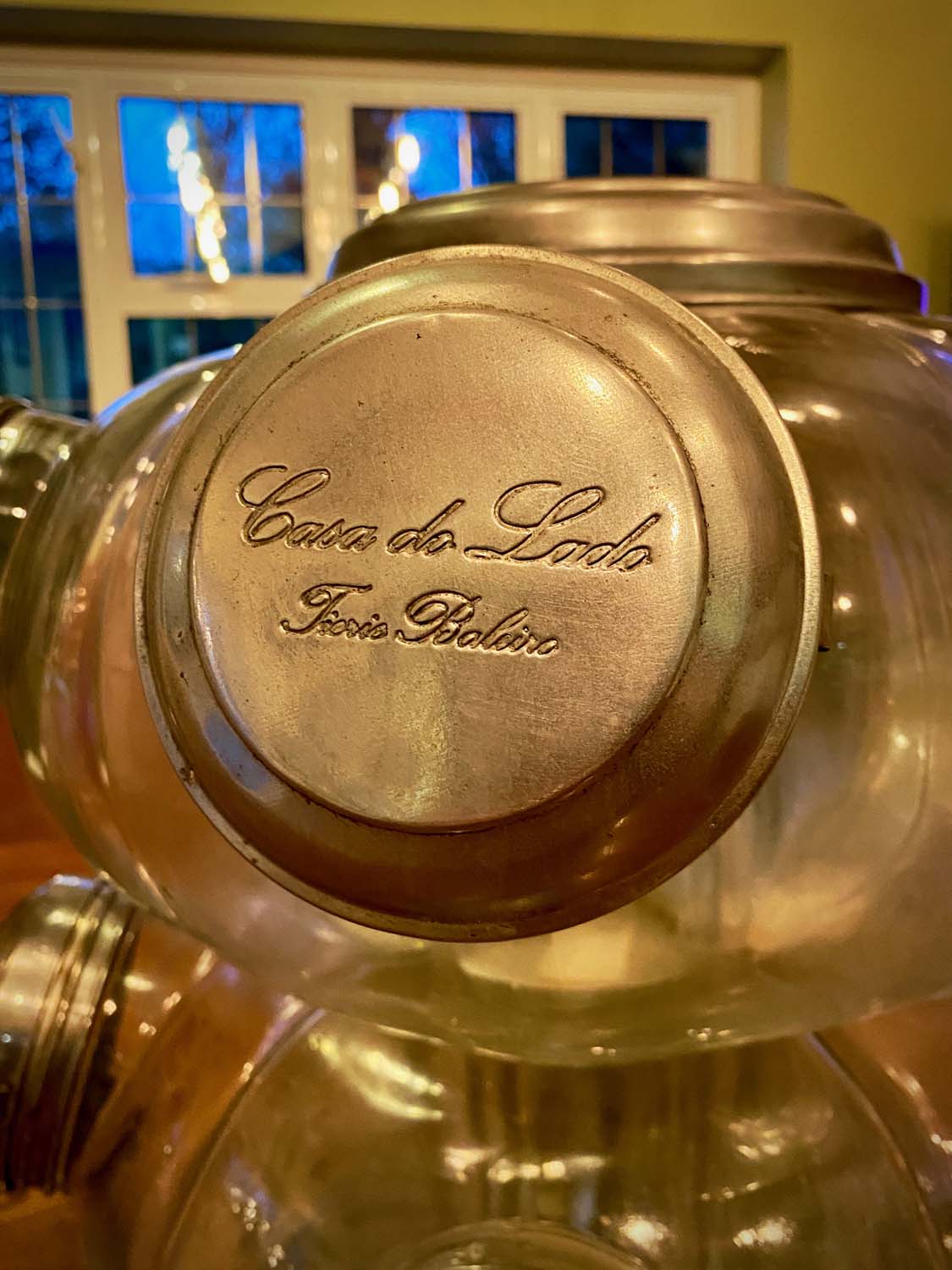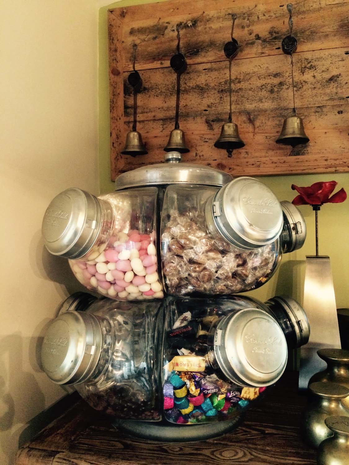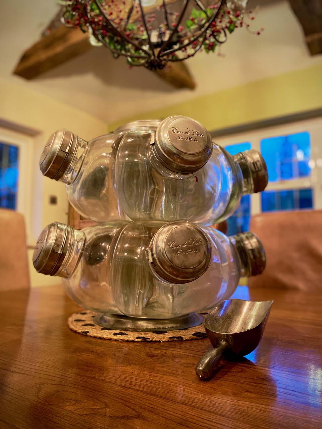 This Balliero consists of 10 separate glass jar which are clamped together by bolts and steel plates. Each jar has its own fold open lid and the whole unit spins on its base, hence the name “Balliero".